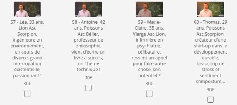 Ce sont des packs d'une ou plusieurs vidéos tutoriels qui viennent compléter les modules de formations (Méthode, Entraînement et Travaux Pratiques). Dans ces vidéos je vous montre comment on l'on peut traiter plus spécifiquement certains aspects délicats des Thèmes Astraux. Les Packs sont remplis de conseils et d'astuces pour donner à vos consultations une autre dimension.